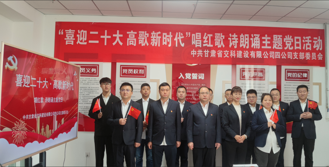 金秋十月,伟大的中国共产党即将迎来第二十次全国代表大会,为营造喜庆、热烈、昂扬、振奋的浓厚氛围,交科公司四公司党支部于10月9日组织开展了“喜迎二十大 高歌新时代”唱红歌、诗朗诵主题党日活动。以红歌献唱、诗歌朗诵的方式,回顾党的光辉历程,讴歌党的丰功伟绩,进一步激发广大职工的爱党爱国热情,展现了四公司全体职工昂扬向上、奋发有为的精神风貌。