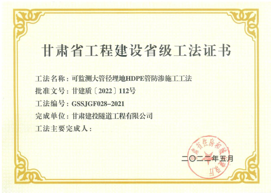 近日,从甘肃省住建厅官网获悉,隧道公司申报的《可监测大管径埋地HDPE管防渗施工工法》获评2021年度甘肃省工程建设省级工法。