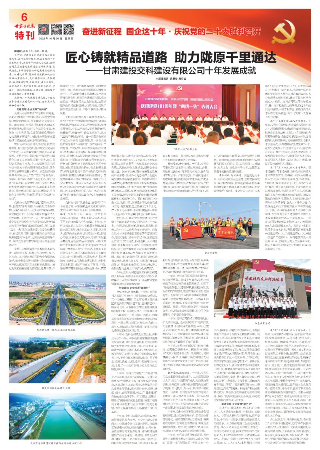 【编者按】:荏苒十年,弹指一挥间。十年前,甘肃省交科建设有限公司乘势而生,在行业跌宕起伏、风云变幻的十个春夏秋冬中,历经十年的洗礼与沉淀,交科公司在高质量发展的道路上蹄疾步稳、乘风破浪,各项经营指标和发展质效稳步提升。纵观这十年,作为乐天堂fun88集团市政公路领域的重要企业,我们艰苦创业,开拓创新,我们诚实守信,合规经营,在兰州新区,在花儿之乡,在河西走廊,在黄土高坡,建设了一大批市政道路、县域公路,为陇原千里通达做出了重要贡献。