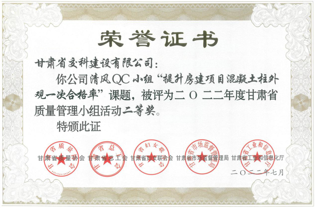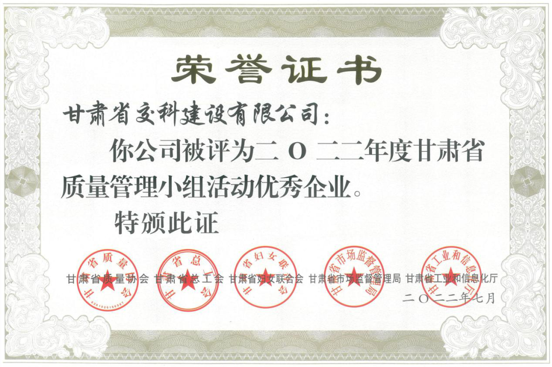 <p style="text-indent: 2em; text-align: left;">近日，从甘肃省质量协会传来喜讯，交科公司三公司两项QC成果《提高沥青混凝土路面平整度一次验收合格率》《缩短预制梁板混凝土强度上升周期》在甘肃省第四十二次质量管理小组活动成果交流会上斩获省级一等奖。交科公司一公司一项QC成果《提升房建项目混凝土柱外观一次合格率》荣获省级二等奖。此外，交科公司还被评为“2022年度甘肃省质量管理小组活动优秀企业”！</p><p style="text-align: center"><img src="../../hdupf/img/202210/202210121665557726374628.png" style="width: 386px; height: 298px;" width="386" height="298"/><img src="../../hdupf/img/202210/202210121665557726740962.png" width="387" height="280" style="width: 387px; height: 280px;"/></p><p style="text-align: center"><img src="../../hdupf/img/202210/202210121665557726553432.png" style="width: 360px; height: 261px;" width="360" height="261"/><img src="../../hdupf/img/202210/202210121665557726778698.png" width="351" height="230" style="width: 351px; height: 230px;"/></p><p style="text-indent: 2em;">截至目前，交科公司连续三年荣获“甘肃省质量管理小组活动优秀企业”荣誉称号，共拥有省级QC成果特等奖2项、一等奖18项、二等奖3项。</p><p style="text-indent: 2em; text-align: left;"><section>近年来，交科公司高度重视QC质量管理活动，建立健全管理QC工作机制及奖惩制度，不断加大QC小组活动组织力度，发挥广大职工智慧力量，解决项目施工中遇到的实际问题，取得了良好成效，为持续提升企业效益、科技创新水平奠定了坚实基础。</section></p><p><br style="text-indent: 2em; text-align: left;"/></p>			</div>