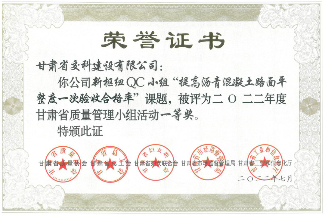 截至目前,交科公司连续三年荣获“甘肃省质量管理小组活动优秀企业”荣誉称号,共拥有省级QC成果特等奖2项、一等奖18项、二等奖3项。