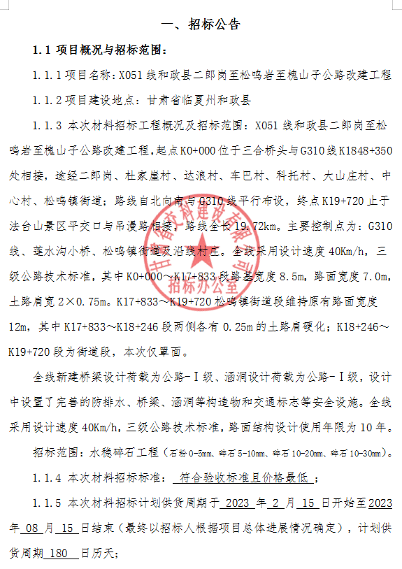 X051线和政县二郎岗至松鸣岩至槐山子公路改建工程水稳碎石材料招标
