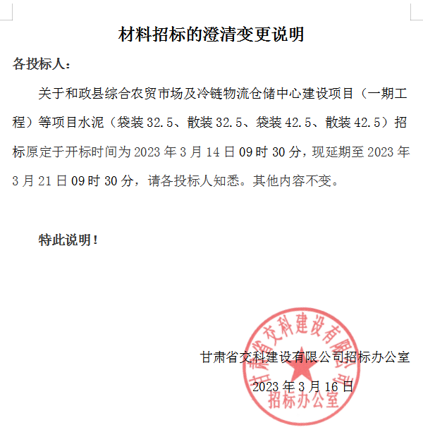 关于和政县综合农贸市场及冷链物流仓储中心建设项目(一期工程)等项目水泥招标的澄清变更说明