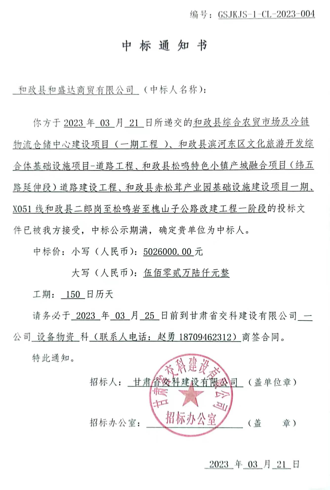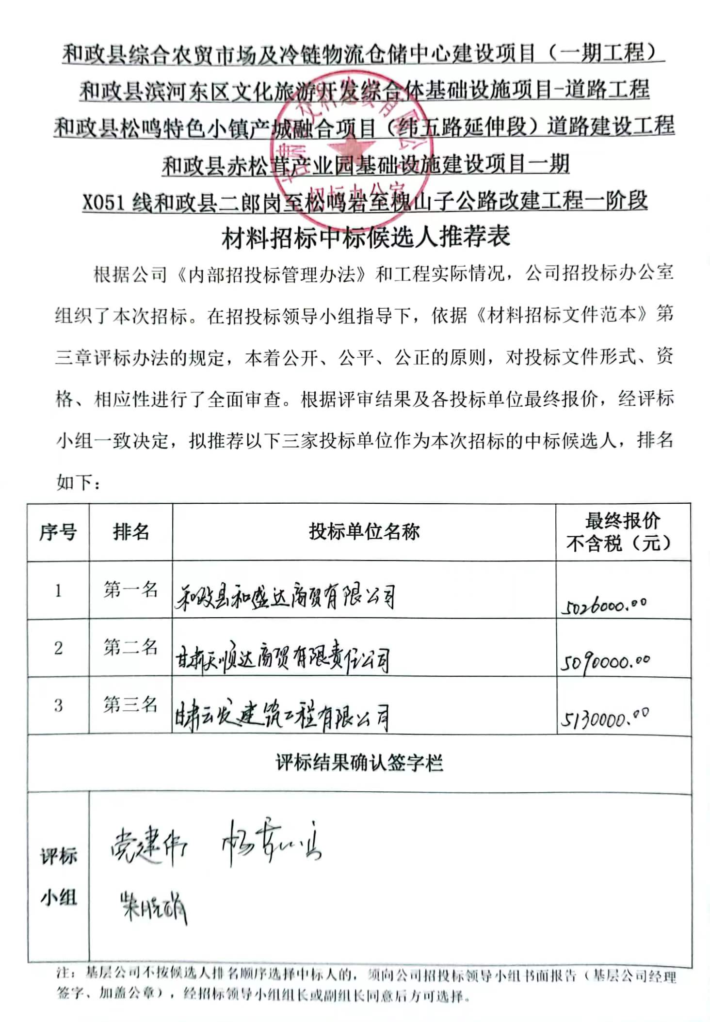 和政县综合农贸市场及冷链物流仓储中心建设项目(一期工程 )等项目中标候选人及中标通知书