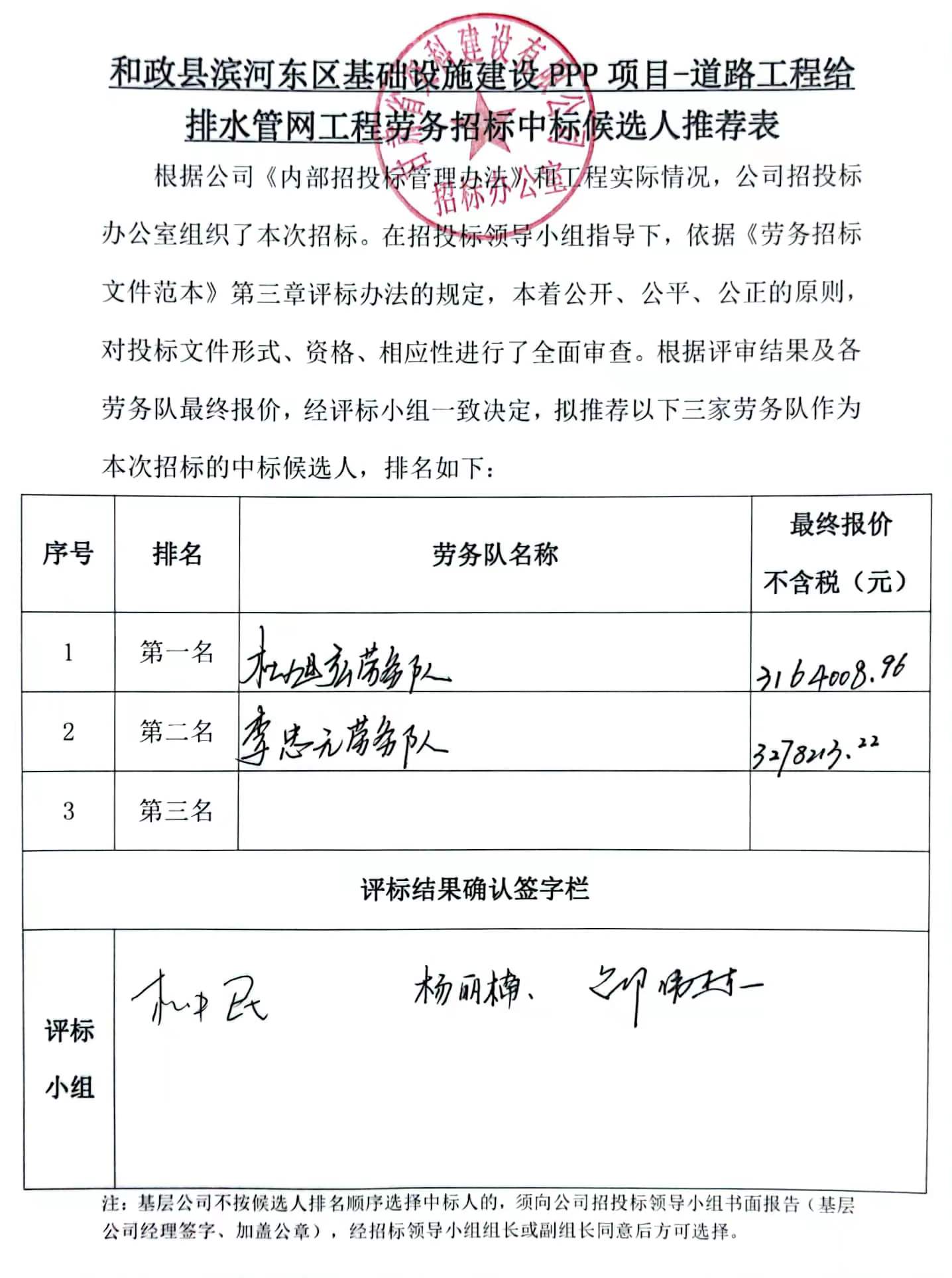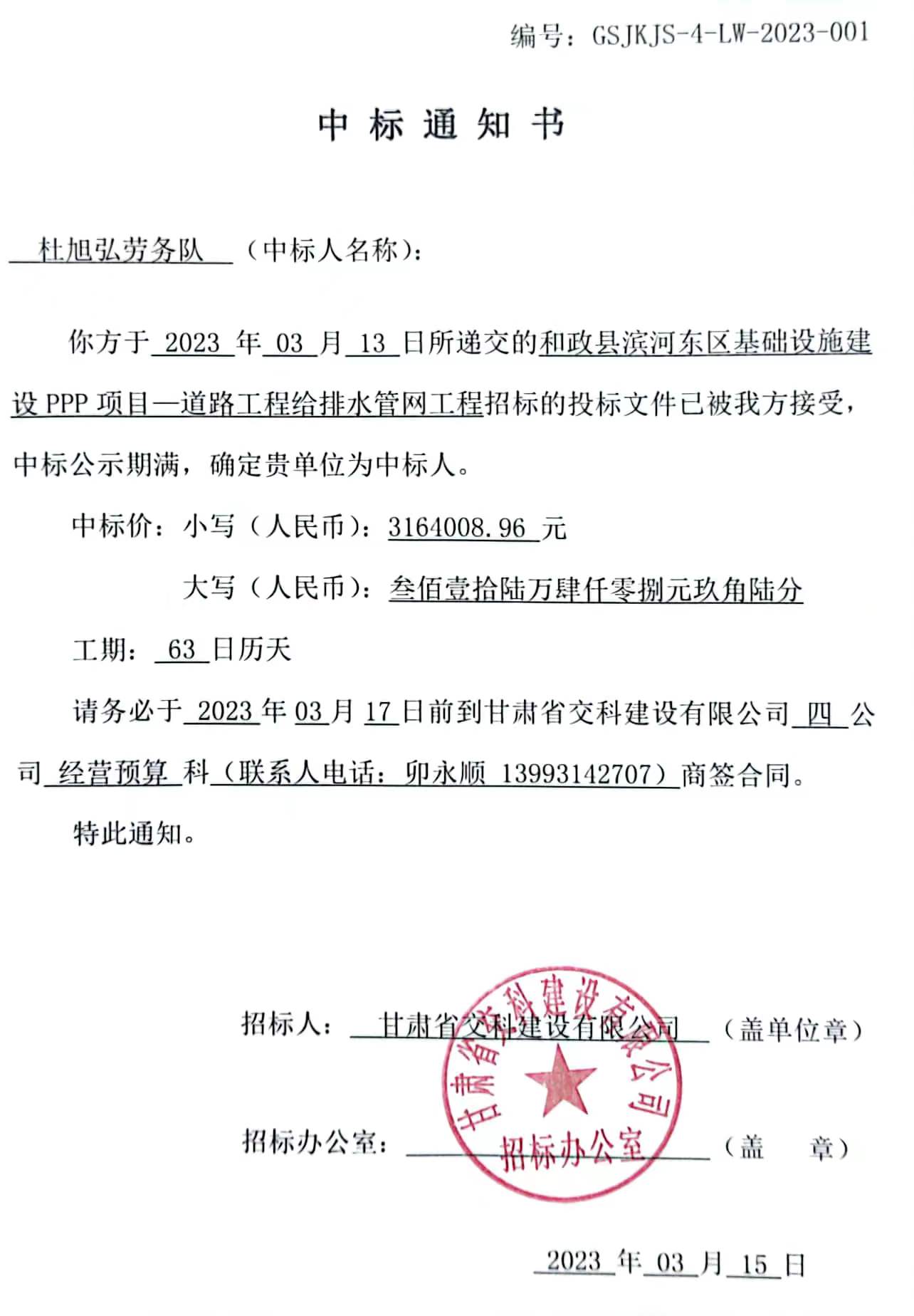 和政县滨河东区基础设施建设PPP项目-道路工程给排水管网工程-中标候选人及中标通知书