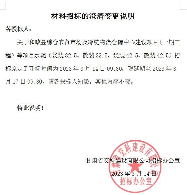 <h3>和政县综合农贸市场及冷链物流仓储中心建设项目（一期工程）等项目材料招标的澄清说明</h3>