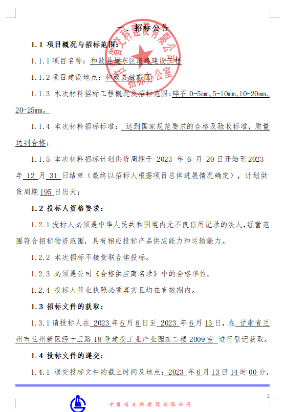 和政县城东区道路建设工程-碎石招标