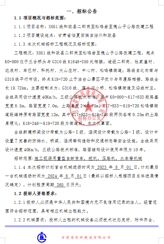 <h3>X051线和政县二郎岗至松鸣岩至槐山子公路改建工程机械租赁招标公告</h3>