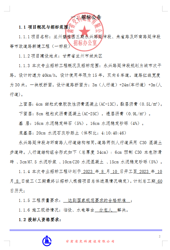<h3>兰州碧桂园三期永兴路延伸段、朱雀路及环南路延伸段等市政道路新建工程（一标段）-专业分包招标公告</h3>