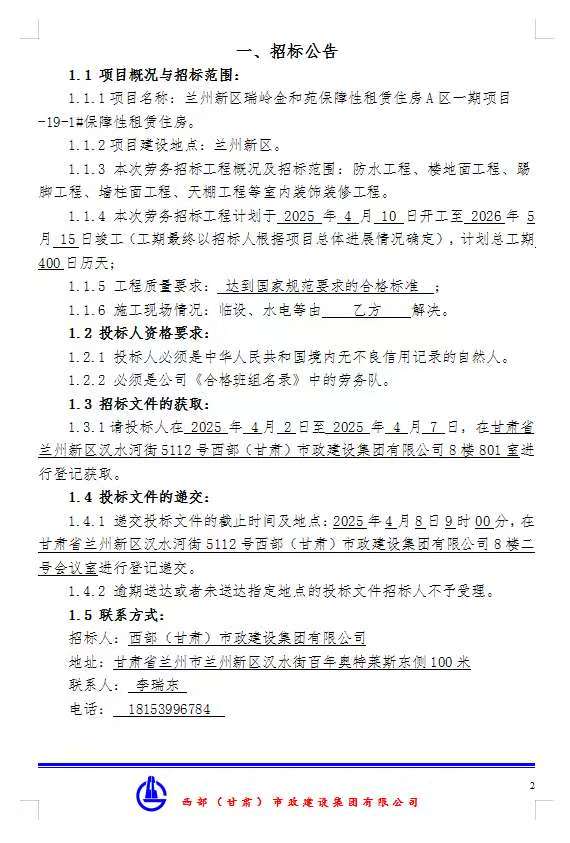 兰州新区瑞岭金和苑保障性租赁住房A区一期项目-19#-1#保障租赁住房-防水工程、楼地面工程等劳务分包招标公告