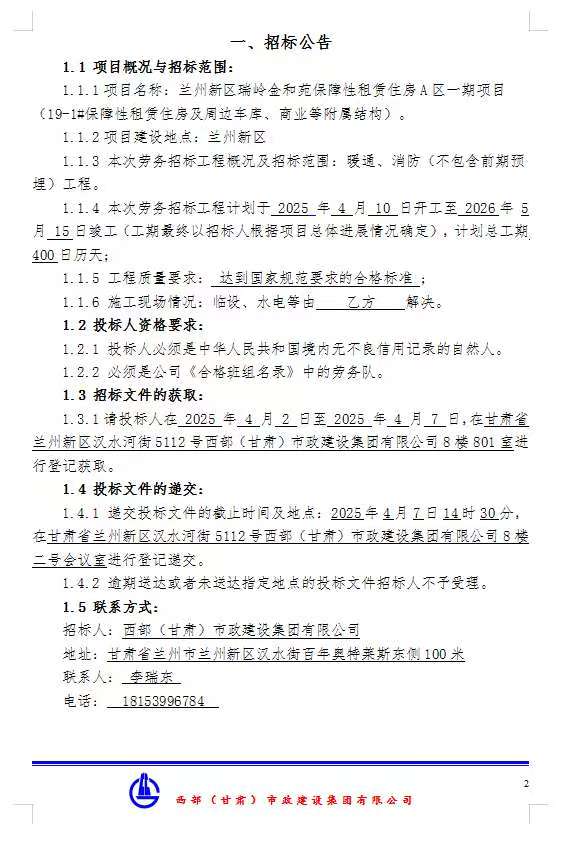 兰州新区瑞岭金和苑保障性租赁住房A区一期项目-19#-1#保障租赁住房及周边车库、商业等附属结构-暖通、消防劳务分包招标公告