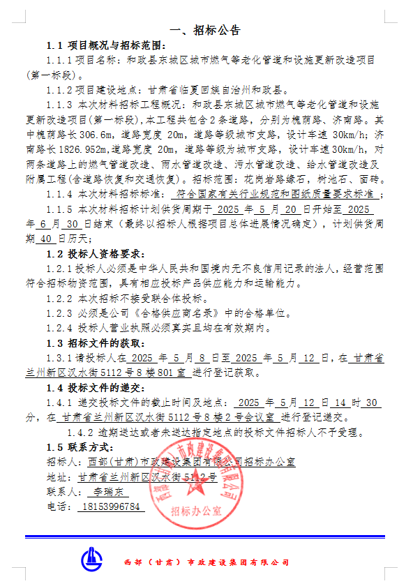 和政县东城区城市燃气等老化管道和设施更新改造项目(第一标段)花岗岩路缘石、树池石、面砖招标公告