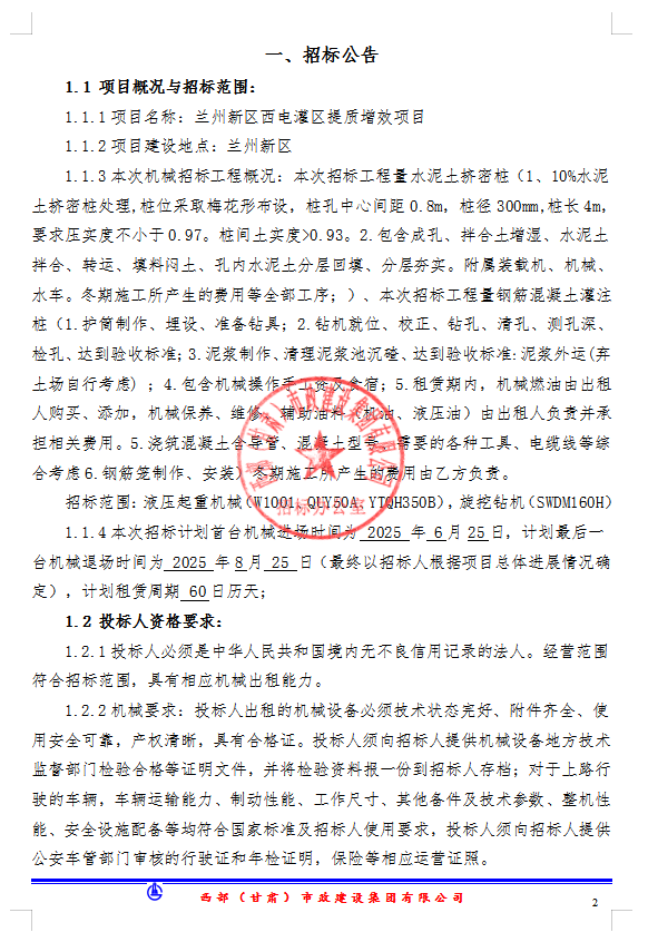 兰州新区西电灌区提质增效项目-机械租赁招标公告