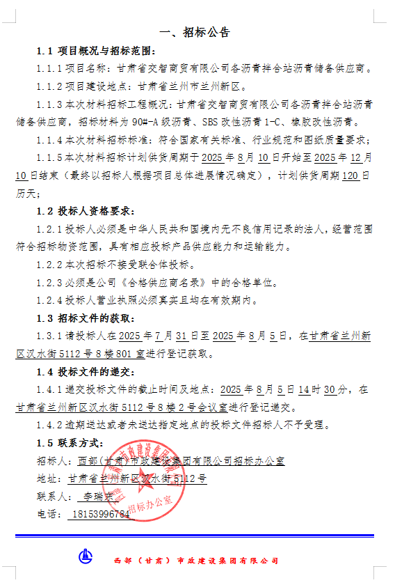 甘肃省交智商贸有限公司各沥青拌合站沥青储备供应商-材料招标公告