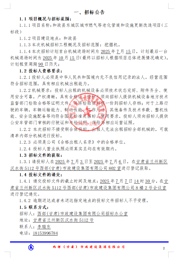 和政县东城区城市燃气等老化管道和设施更新改造项目(三标段)--机械租赁-招标公告