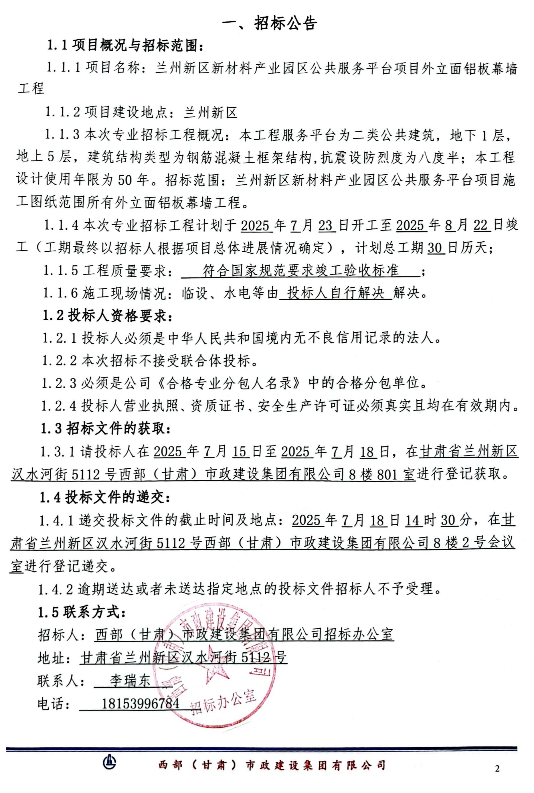 兰州新区新材料产业园区公共服务平台项目外立面铝板幕墙工程-专业分包-招标公告