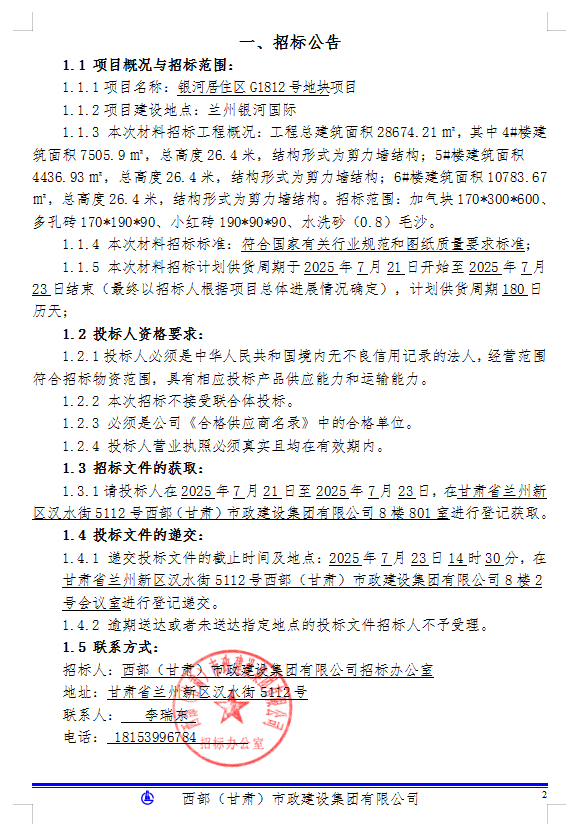 银河居住区G1812号地块项目-材料招标-招标公告