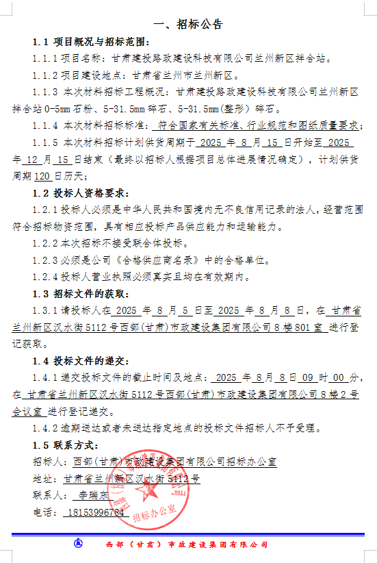 乐天堂fun88集团路政建设科技有限公司兰州新区拌合站-材料招标公告